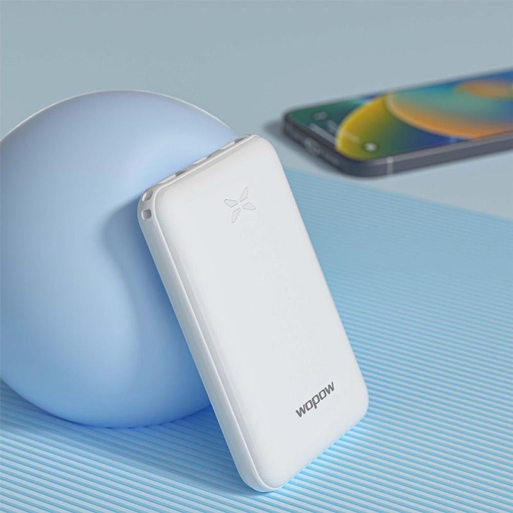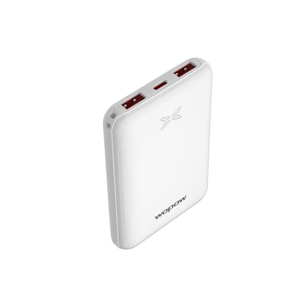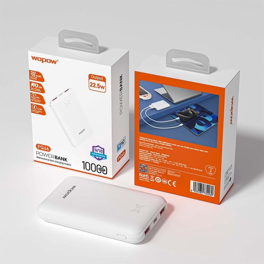 شاحن متنقل PQ46 باللون الأبيض .بمنفذين USB A ومنفذ Type-C لشحن الهواتف الذكية.وتستطيع اعادة شحن البطارية المتنقلة عن طريق منفذ الـ Type.-C.مسموح حملها بالطائرة.تتميز بتقنية PD وبقوة 22.5 واط لشحن الآي...