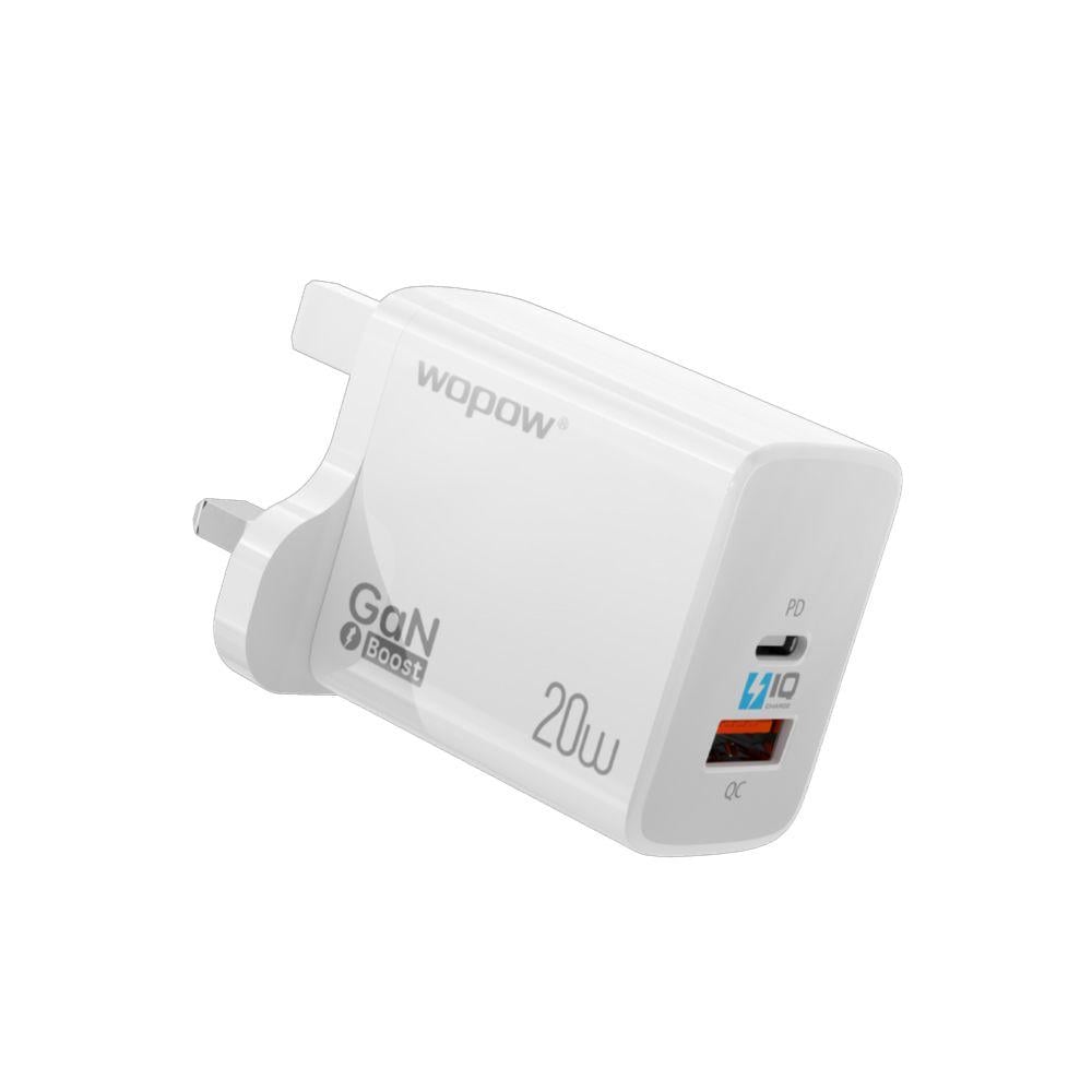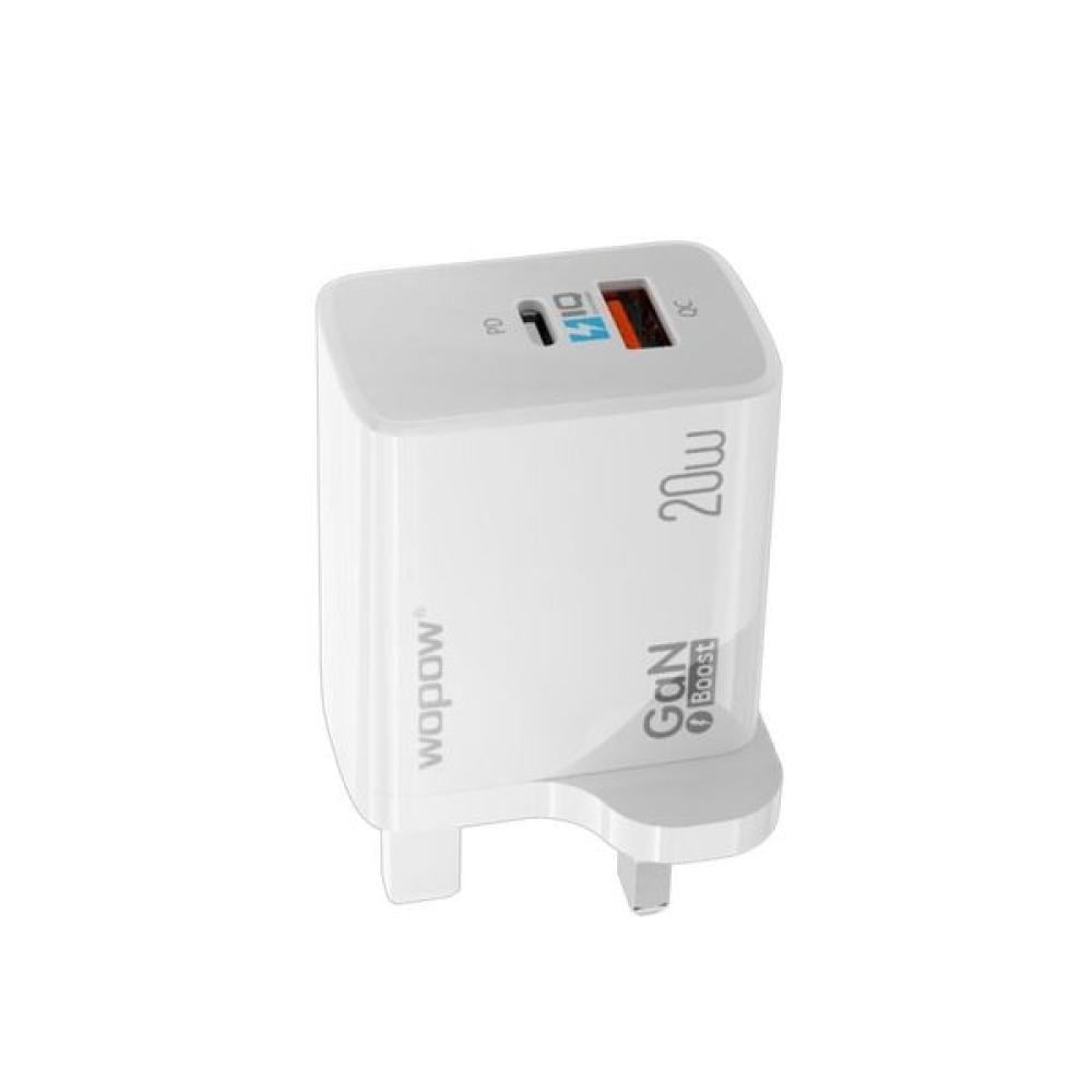 شاحن جداري ووبو A20Pro أبيض بمنفذ Type-C ومنفذ USB.تتميز بتقنية PD لشحن الآيفون بسرعة فائقة من 0% الى 50% خلال 30 دقيقة.وتقنية الـ QC4.0 للشحن الامن لاجهزة الاندرويد.وتقنية الـ I...